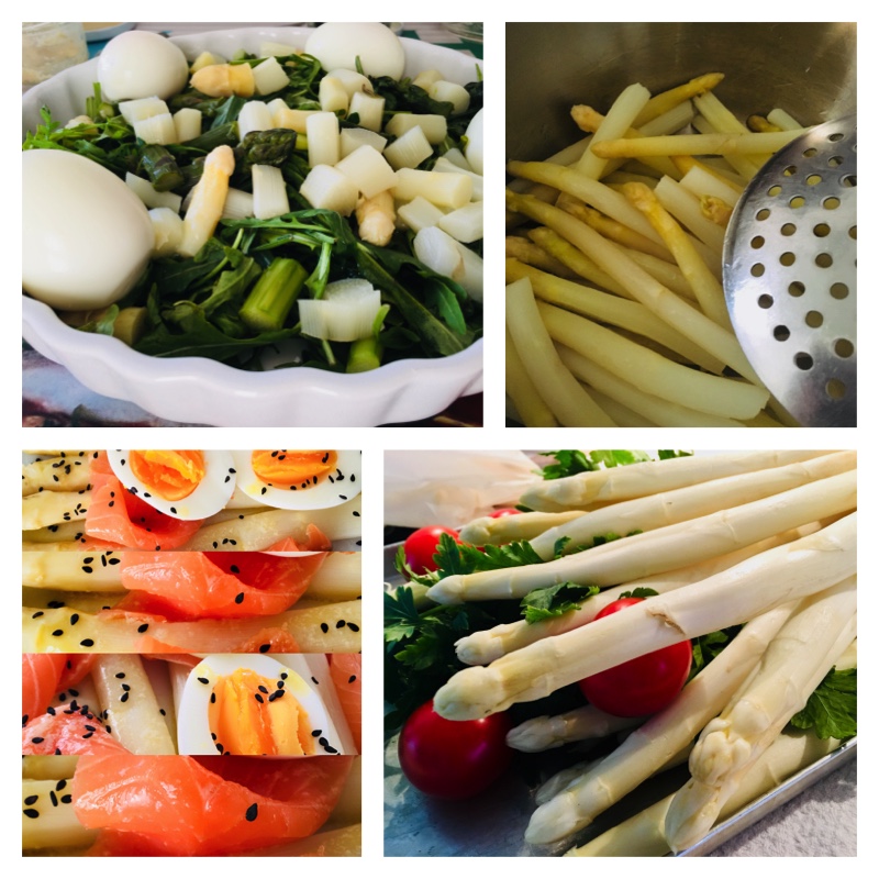 Rucola mit weißem und grünen Spargel, dazu wachsweich gekochte Eierhälften umhüllt von Räucherlachs. Klassisch, ausschließlich etwas gesalzen und mit einer leichten Zitronen-Sonnenblumenöl-Marinade beglückt.