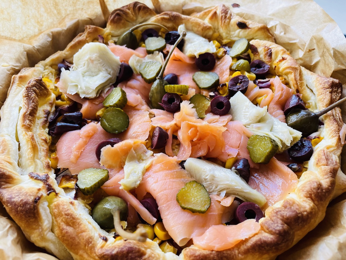 Hier habe ich den Teig in eine Tarteform gelegt und mit Schmand bestrichen, der Geschmack ähnelt so ein bisschen dem Charakter von Flammkuchen. Darauf lege ich Gemüse und die frischen Zutaten, die ich gern backen möchte. Dann kommt die Tarte bei 160 Grad Umluft für ca. 25 Minuten in den Ofen. Danach lasse ich sie fünf Minuten stehen, um nun die kalten Köstlichkeiten aufzulegen. Es passen wie hier Lachs, Oliven, Gürkchen, Artischocken aber ganz wundervoll sind auch Schinken, Basilikum und Büffelmozzarella. Du entscheidest!