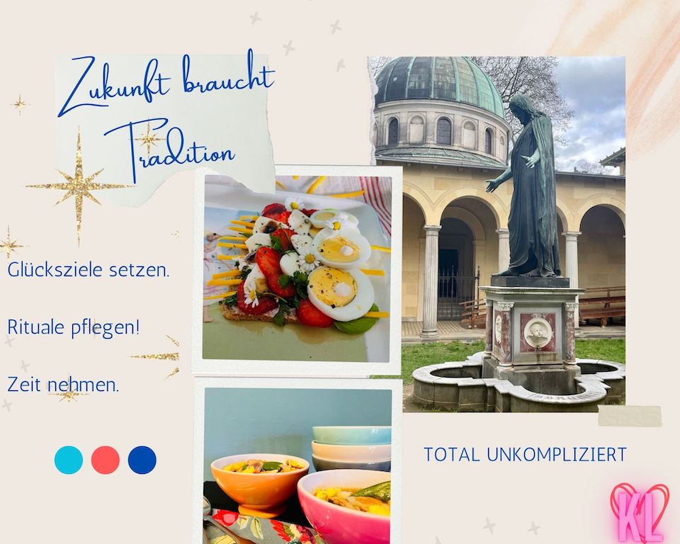 Rituale und gelebte Traditionen schenken mir ein Gefühl des Verbundenseins. Manchmal gehört dies ausschließlich mir und meinen Erinnerungen, dennoch gibt es auch Aktionen, die ich sehr gern teile. Zusammen über den Wochenmarkt zu schlendern, ist eine immer wieder willkommene Alltagshandlung. Eine große Schüssel prall gefüllt mit frischem Salat, dazu hübsch verzierte Brote – welch ein Augen- und Gaumenschmaus.